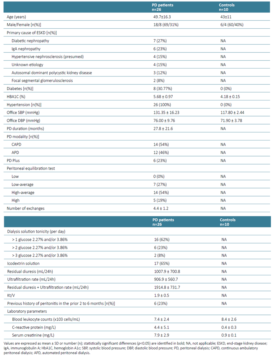 Twenty‑six chronic PD patients aged≥ 18 years and 10 healthy controls were recruited from routine consultations. All participants provided written informed consent and approval from the Ethics Committee of ULS Castelo Branco, EPE‑Hospital Amato Lusitano was obtained (IRB approval number: 014862). None of the patients was on glucocorticoids or another immunosuppressive agent in the last 6 months or had a diagnosis of peritonitis or another active infectious disease in the last 30 days. Ten healthy, age and sex‑matched volunteers were included as the control group. They had no medical history of hypertension, diabetes, or immune‑related disorders, as well as any ongoing inflammatory process, as accessed by the measurement of serum C‑reactive protein levels (CRP). PD patients were subsequently evaluated according to dialysis modality [continuous ambulatory peritoneal dialysis (CAPD) versus automated peritoneal dialysis (APD)], glucose exposure [≥ 3 hypertonic (defined as glucose 2.27% and/or 3.86%) solutions/day,)], icodextrin use, dialysis efficiency (urea Kt/V) and previous history of peritonitis in the prior 2 to 6 months.