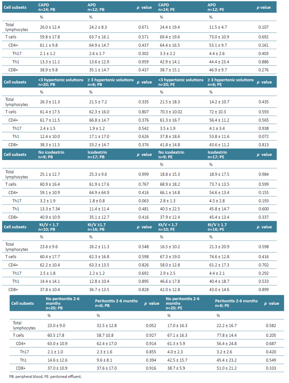 The percentages of total lymphocytes, T cells and T cells subsets (TCD4+, Th17, Th1 and TCD8+) were identical between the different PD modalities (Table 3). In our sample, the average number of exchanges/day in APD patients was 5.5 ± 0.7 and in CAPD patients was 3.4 ± 0.5.