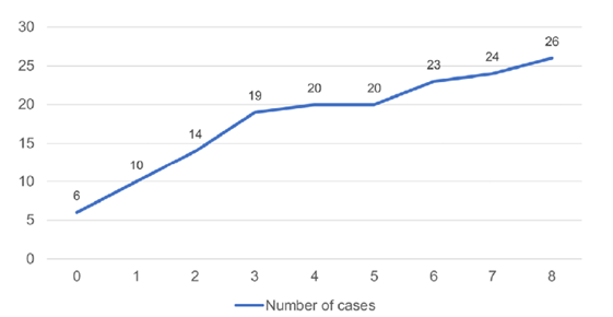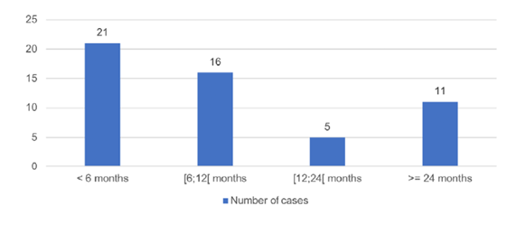 No cases of bilateral MCDK were reported and the left kidney was involved in 28 cases (52.9%). Reno‑vesical ultrasound was performed in all children. Other diagnostic tests were also performed in 50 children (94.3%): Tc‑99m DMSA scintigraphy in 29 (54.7%), 99mTc‑MAG3 scintigraphy in 28 (52.8%), and voiding cystourethrography in 28 (52.8%). Antibiotic prophylaxis was prescribed in 24 children (45.3%). Five children underwent surgery (three for the treatment of ureterocele and two because of contralateral pathology). Involution of the affected kidney was observed in 51 cases (96.2%), with a complete involution in 26 (49.1%). The median age of complete involution was two years, and the child was younger than five years in 20 cases (Fig. 3). Contralateral hypertrophy was documented in 35 cases (66.0%). Complications were reported in 18 children (34.0%): urinary tract infections in 12 cases (22.6%), proteinuria in four (7.5%), CKD in three (5.7%) and hyper‑ tension in one (1.9%). There were no reported cases of malignancy.