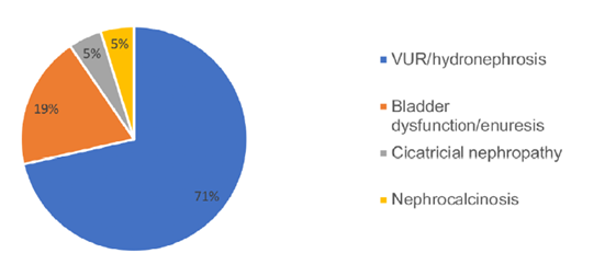 Twenty‑one cases (39.6%) had other kidney abnormalities, with the most common being vesicoureteral reflux (VUR) / hydronephrosis (Fig. 2). Extrarenal malformations and syndromes were present in eight children (15.1%), including tetralogy of Fallot, Di George syndrome, branchio‑oculo‑facial syndrome and other polymalformative syndromes. Family history of renal disease was present in 15 children (28.3%), renal agenesis being the most common (five cases), followed by nephrolithiasis, MCKD, renal duplication and pelvic kidney.