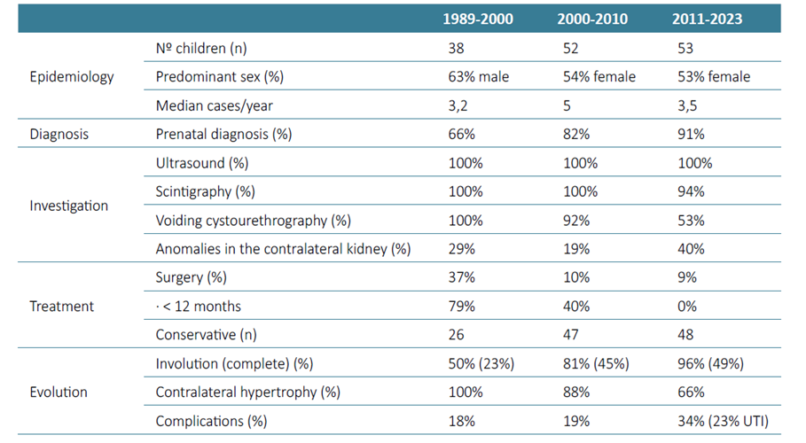 The natural history is involution of the affected kidney in most cases. The rate of involution is generally greatest during the first two years of life and is completed by five years in 60% of cases.1‑4,9Our study showed a slightly lower rate of complete involution at five years (38%), but there was a higher rate of partial and complete involution compared with the previous study periods, with almost all of the children (96%) showing some degree of involution. If the contralateral kidney has no abnormalities, it usually undergoes compensatory hypertrophy, which is typically observed by three years of age.1,3,4,9,10The absence of compensatory hypertrophy suggests abnormalities of the contralateral kidney.1,4,9There was a clear decrease in the compensatory hypertrophy rate over the three study periods (from 100% to 66%). Although there is no clear explanation for this finding, this decrease may be associated withs higher rates of concomitant pathology in the contralateral kidney (40%), and complications (34%) found in the last study period. The number of children with comorbidities in the contralateral kidney and complications may have increased in our unit due to the less invasive approach adopted in recent years, which allowed children with a more benign course of the disease to maintain follow‑up with their Family Physician or attending Pediatrician, without the need for referral to a subspecialty.