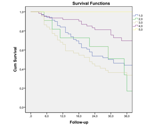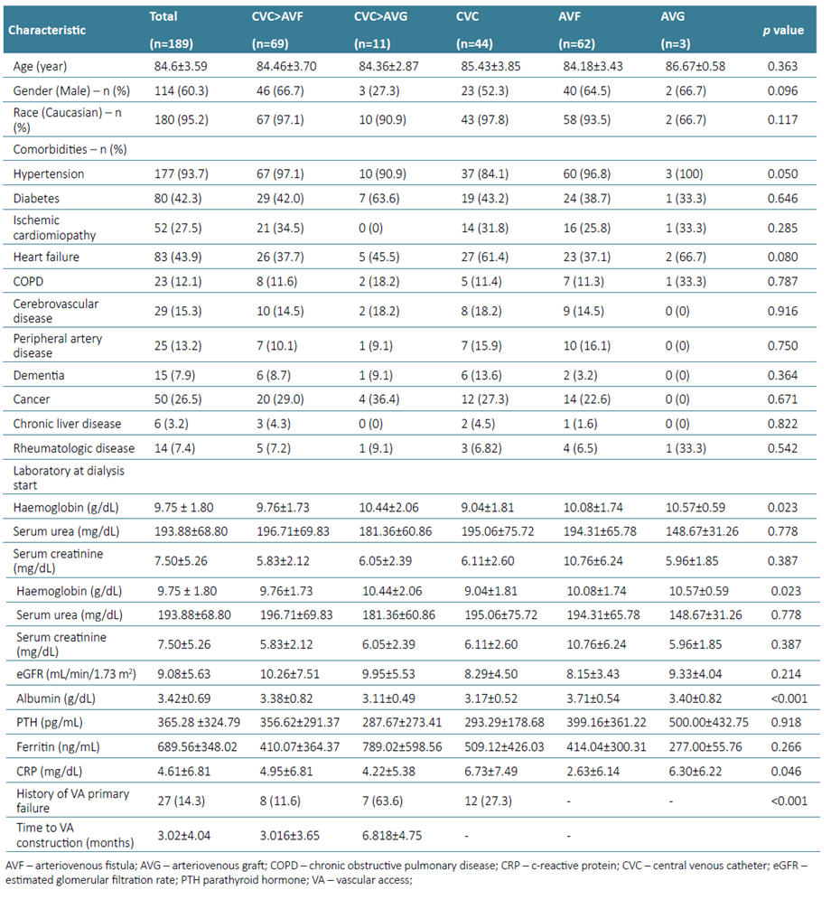 Vascular access at HD start was a CVC in 124 patients (65.6%), whereas 62 (32.8%) started with an AVF and only 3 patients (1.6%) started with an AVG. During follow‑up, from those who started HD through a CVC, 27 (21.8%) had a history of vascular access primary failure. In sixty‑nine (36.5%) patients a functional AVF was created and in 11 (5.8%) an AVG was placed. Forty‑four patients (23.3%) remained with a CVC during follow‑up. The time to construction of a functional AVF or AVG was 3.6 ± 4.0 months. Patients baseline characteristics were similar across all five groups. However, patients who remained with a CVC and who did not have an AVF of AVG created had lower Hb (p=0.023), higher NL ratio (p=0.025), lower serum albumin (p<0.001) and higher CRP (p=0.046) at dialysis start (Table 1).