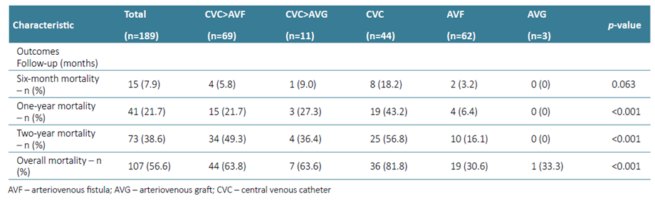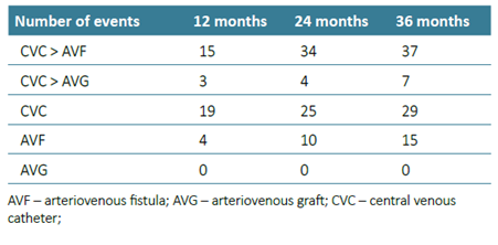 This work has some limitations of which we highlight the retrospective and single‑center nature of the study. Also, we did not differentiate patients according to previous follow‑ups by a nephrologist nor whether dialysis start was planned or emergent. Additionally, comorbidities are coded as present or absent, and not by their severity. For example, two patients may be categorized as having diabetes; however, one has had the disease for 3 years, with good glycemic control and no macrovascular disease and the second has more than 20 years of diabetes, poor glycemic control and severe cardiovascular complications. Also, we report clinical outcomes based on vascular access at dialysis initiation, but updated information on vascular access was not available during follow‑up. Finally, causes of mortality were not assessed.