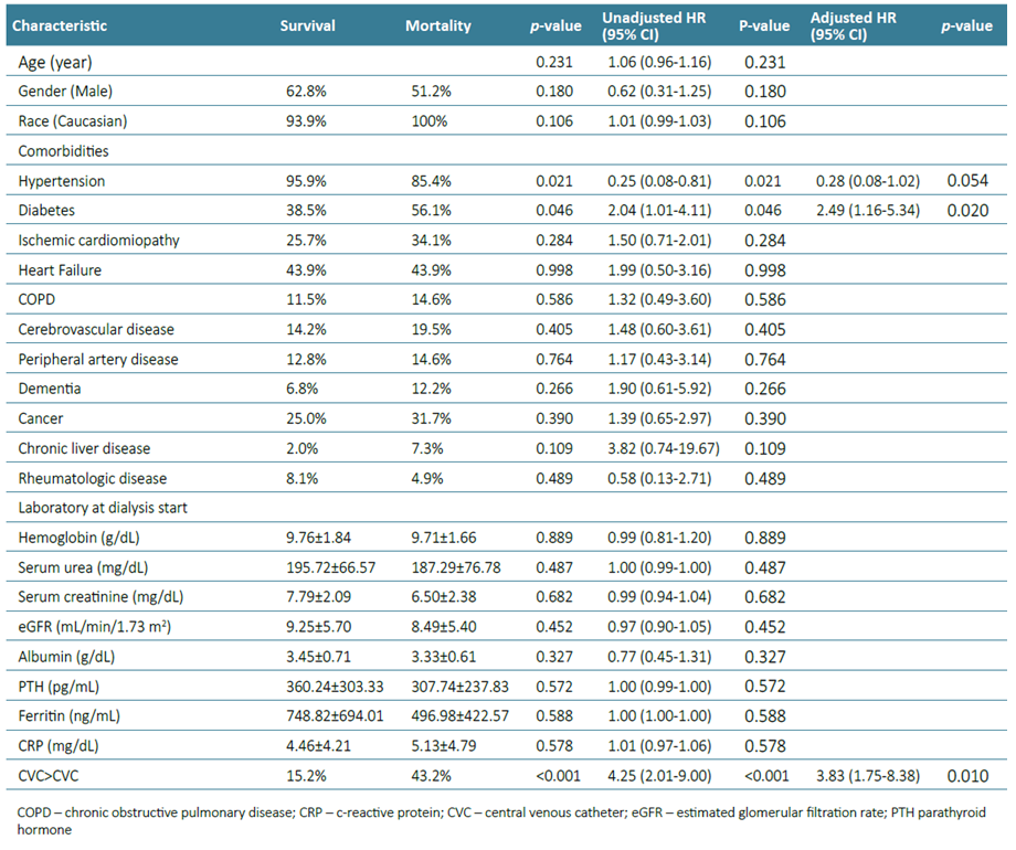 Multiple previous studies have demonstrated that patients who start HD with a CVC have lower survival compared to those who start with an AVF or AVG.20‑22 In those who start HD with a CVC, switching to arteriovenous access has also been associated with a substantial decrease in mortality risk (30%‑60% lower adjusted risk of death) as well as other important endpoints such as malnutrition, inflammation and anemia.23‑25 Several other comorbidities such as diabetes, hypertension, and heart failure, as well as laboratory parameters like hemoglobin, albumin and ferritin, have also been shown to be important mortality predictors in HD patients.26‑28 In our study, however, only diabetes was a predictor of mortality and there was a tendency towards hypertension to be protective. This inquiring aspect may be assignable to the fact that comorbidities inducing hypotension, such as multiple myeloma or amyloidosis, may be more frequently associated with mortality. Also, hypotensive patients had more frequent CVC as definitive VA, which could have an impact in the ability to create arteriovenous access. Although in our study, we did not identify other factors, such as malnutrition and inflammation as predictors of mortality, this may be due to the reduced number of patients in the sample. We also highlight the high number of cancer patients, which may also explain the 3‑year mortality.