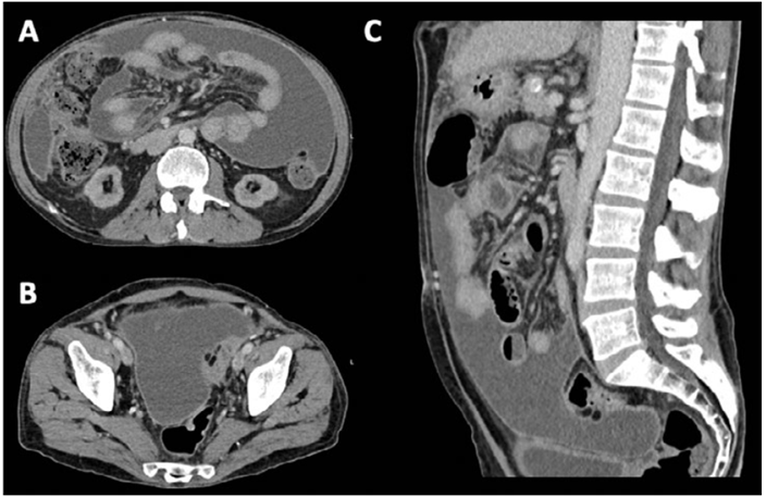 Figure1. CT‑scan transversal (A and B) and sagittal planes (C). Bulky ascites, peritoneum thickening, and diffuse micronodularity of the great omentum and across the mesentery, favoring peritoneal carcinomatosis.