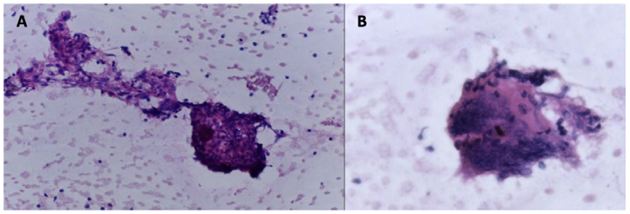 Figure 2. Fine needle cervical lymph nodule biopsy. A- Epithelioid granuloma (HE, 100x). B- Giant cell (HE, 400x). These findings corroborate the presence of a granulomatous process.
