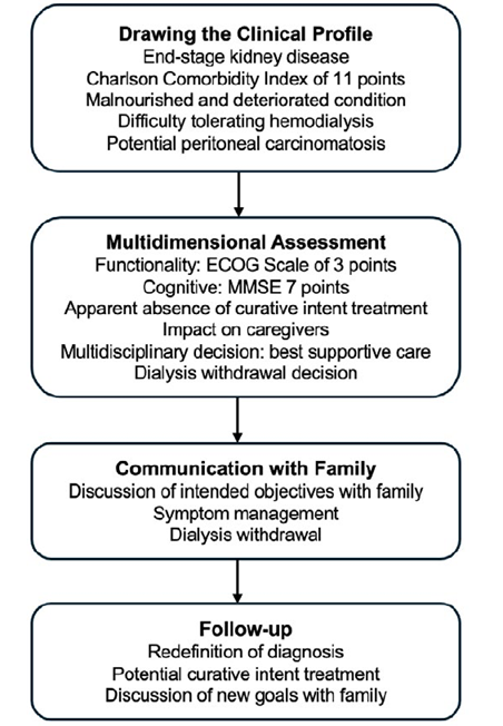 Figure 3 The flowchart of the decision‑making process taken in our patient. The diagram illustrates the initial clinical profiling, a comprehensive multidimensional assessment, the crucial communication with the family regarding symptom management and dialysis withdrawal, and a follow‑up stage where the diagnosis and treatment options were reconsidered.