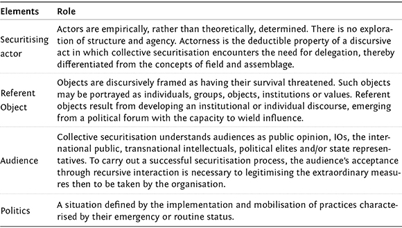 Collective securitisation varies in terms of its dimensions: on the one hand, a state or a small group of states can advocate for attention towards a given security issue within an io. In doing so, it/they may obtain the support of other member states and, as a result, empower the organisation to adopt policies and exceptional or routine practices to respond to the constructed threat. Notwithstanding this, there is also the scope for a state’s actorness being anchored in the aggregate function, meaning the io experiences enough autonomy to act independently of its member states (Sperling and Webber, 2019).