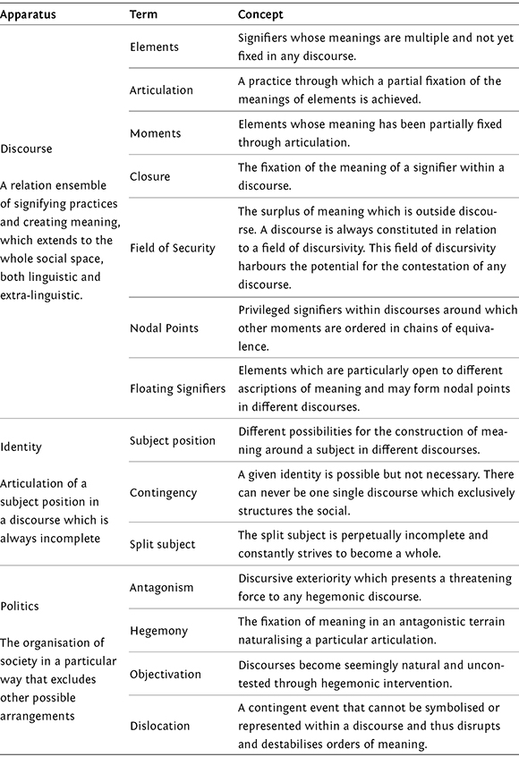 Although discourse analysis is generally perceived as a method, it nevertheless implies a methodology that integrates a set of assumptions about language as a practice with a constructive effect. Müller’s (2011) work, developed through Laclau and Mouffe’s discourse theory (Table 2) of discourse analysis, divides it into a three-dimensional approach: the context of analysis - proximate context and distal context -, analytic form of analysis - interpretative-explanatory and post-/structuralist -, and political stance of analysis - involved or detached. Such dimensions may furthermore be aggregated into a set of approaches to discourse analysis, specifically Critical Discourse Analysis, meso-level analysis, parallels with narrative analysis as well as discursive hegemonic strategies, conceptual metaphor theory, and representational strategies (Osisanwo, 2022; Olimat, 2020; Santos, 2018; Müller, 2011).
