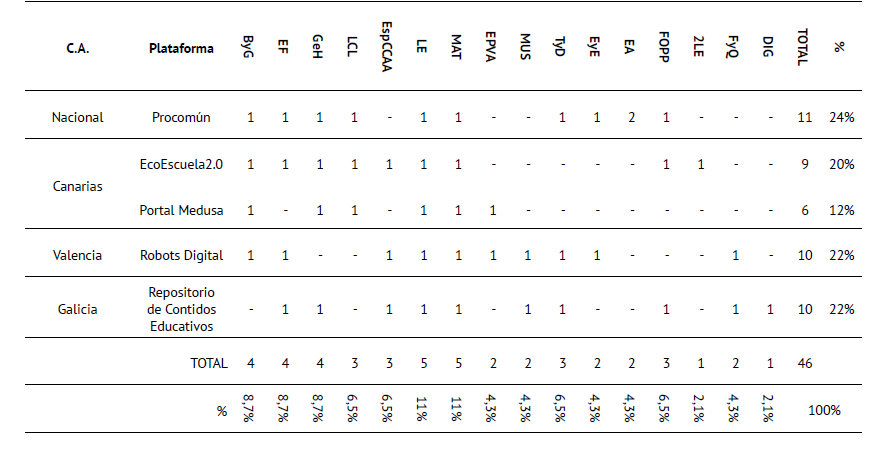La siguiente tabla muestra el número de recursos analizados de los que se han seleccionado los materiales para el estudio según las plataformas institucionales -nacional y autonómicas- y las asignaturas incluidas en el análisis.
