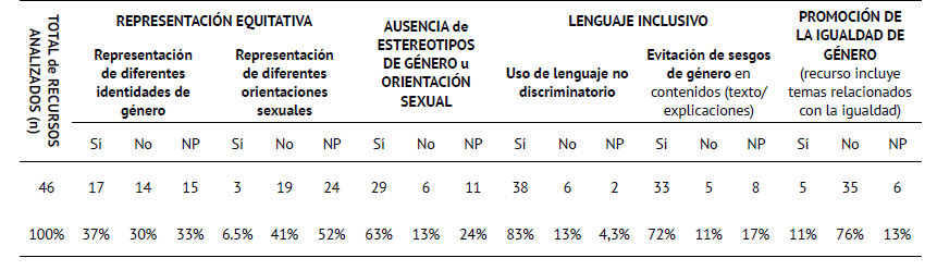 El análisis de los materiales didácticos digitales desde la perspectiva de género se realizó, en un primer momento, atendiendo a los datos obtenidos desde una perspectiva general (véase Tabla 1) para, a continuación, considerar la distribución de recursos analizados (n=46) atendiendo a las distintas variables clave implicadas en este estudio -representación equitativa, ausencia de estereotipos de género y orientación sexual, uso de lenguaje inclusivo y promoción de la igualdad de género-, incluidas en la dimensión coeducación/inclusión del instrumento de recogida de información (véanse Tabla 2 y Tabla 3).