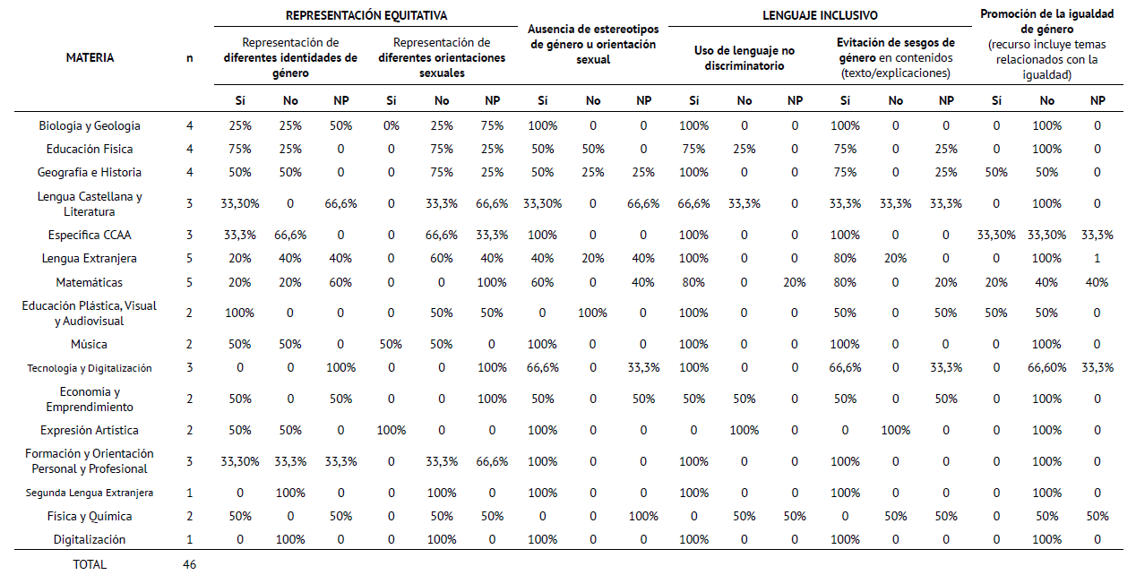 Desagregando estos datos (Tabla 3), observamos que la utilización de un lenguaje inclusivo y cuidado para evitar discriminaciones y sesgos de género es más evidente en las materias de Biología y Geología, Específicas de las CCAA, Música, y Formación y Orientación Personal y Profesional, entre otras. En el lado opuesto es preciso mencionar la materia de Expresión Artística y los recursos educativos que aporta a la muestra, en los cuales se debe mejorar este aspecto al emplear un lenguaje no inclusivo en sus contenidos.