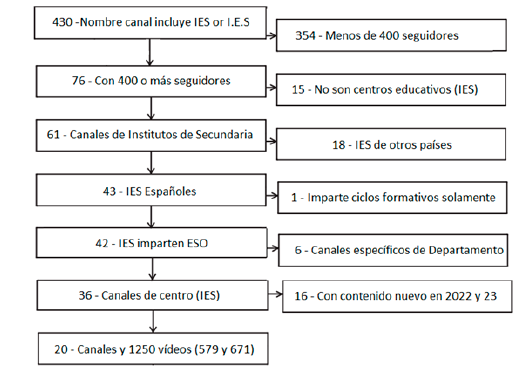 Para responder a estos interrogantes hubo que establecer tres fases de desarrollo en la investigación, una primera destinada a la selección de la muestra, una segunda destinada a recoger la información pertinente de los canales y una tercera, con la revisión y clasificación de los vídeos. En relación a la primera fase, se optó por hacer uso del método PRISMA (Preferred Reporting Items for Systematic Reviews and Meta-Analyse), valorado como uno de los protocolos más utilizados y consolidados para la revisión sistemática de literatura (Sánchez-Serrano et al., 2022). En su caso, este método se aplicará para realizar una revisión sistémica de canales, permitiendo definir una estrategia de búsqueda exhaustiva en YouTube tras especificar los criterios de inclusión y exclusión. La muestra resultante estuvo compuesta por 20 canales y 1250 vídeos para el análisis al incluir: