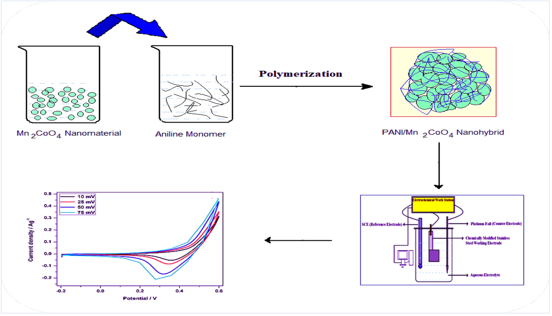 MnCo2O4 has been reported as a potential material for energy storage 12-15, although its electrochemical performance is reduced at higher j values. So, there is the need to combine metal oxides with other materials, to improve their capacity and stability. Herein, NHP from PANI/Mn2CoO4 was synthesized by a simple chemical polymerization method. Its structural properties were studied by various physicochemical characterization methods, such as FT-IR, X-RD and SEM. Electrochemical and charge-discharge results revealed PANI/Mn2CoO4 enhanced SC potential.