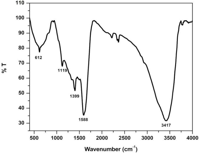 N=Q=N ring vibration mode appeared at 1119 cm-1. C=C for quinonoid and benzenoid rings occurred at 1588 and 1399 cm-1, respectively 20-22. The sharp intense peak that came at 612 cm-1 was assigned to Co-O bonding, and confirmed Mn2CoO4 incorporation into PANI matrix. Wider and broader band centers at 3417 cm-1 were attributed to N-H and O-H vibration stretching modes. This broad vibration confirmed hydrogen bond formation between Mn2CoO4 nanoparticles and N-H groups of PANI 23.