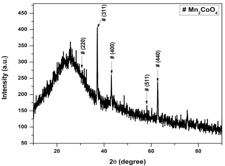 X-RD pattern of NHP from PANI/Mn2CoO4 is shown in Fig. 2. The intense peaks that appear in X-RD indicate that PANI’s increased crystallinity was due to Mn2CoO4 addition.