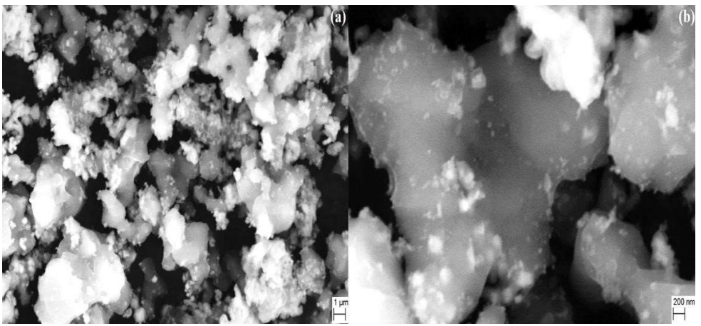 where k is 0.9 (constant), λ is Cu-kɑ radiation wave length (1.5418 Å), β is FWHM in radians, and θ is Bragg’s diffraction angle at maximum intensity. PANI/Mn2CoO4 average particle size (60 nm) was calculated from the most intense XR-D maxima, by applying this equation. SEM images of PANI/Mn2CoO4 are shown in Fig. 3 ((a) and (b), where the particles are clearly seen, highly aggregated, and have a porous nature.