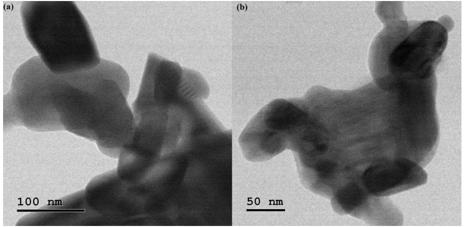 TEM images show that NHP particles do not have a uniform size and shape, due to Mn2CoO4 nanoparticles incorporation into PANI matrix, which significantly changed the material morphology and size. Mn2CoO4 appeared as dark black particles well embedded into PANI matrix whole surface.