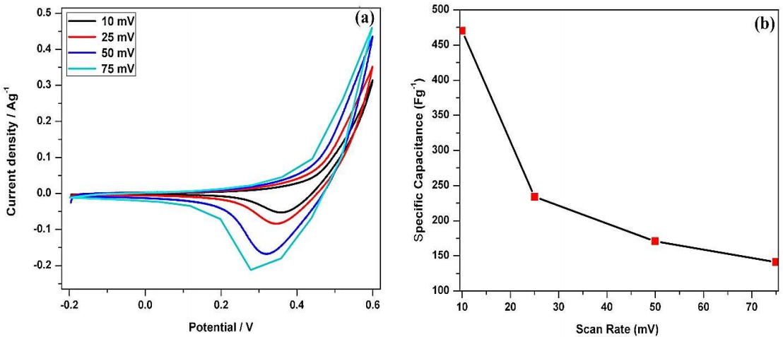 Fig. 5b depicts PANI/Mn2CoO4 electrode variation in its specific capacitance, with respect to SR. It was seen that specific capacitance values steadily decreased with increasing SR from 10 to 75 mV/s-1. E sweep was slow at the lower SR. This facilitated the diffusion of a greater number of ions into the electrode, which increased the utility of the active material present on its surface. The specific capacitance values observed at higher SR (25, 50 and 75 mV/s-1) were relatively much lower, due to quick E sweep, which reduced ionic diffusion rate. The synergistic effect between Mn2CoO4 and PANI accelerated the reaction rate at the electrode-electrolyte interface, which facilitated the occurrence of redox reactions 33.