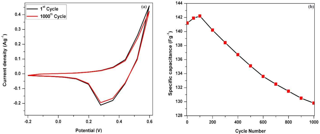 Figure 6: (a) 1st and 1000th cycle of PANI/Mn2CoO4 electrode in a 1 M KOH aqueous solution; (b) Plot of cycle number vs. specific capacitance.
