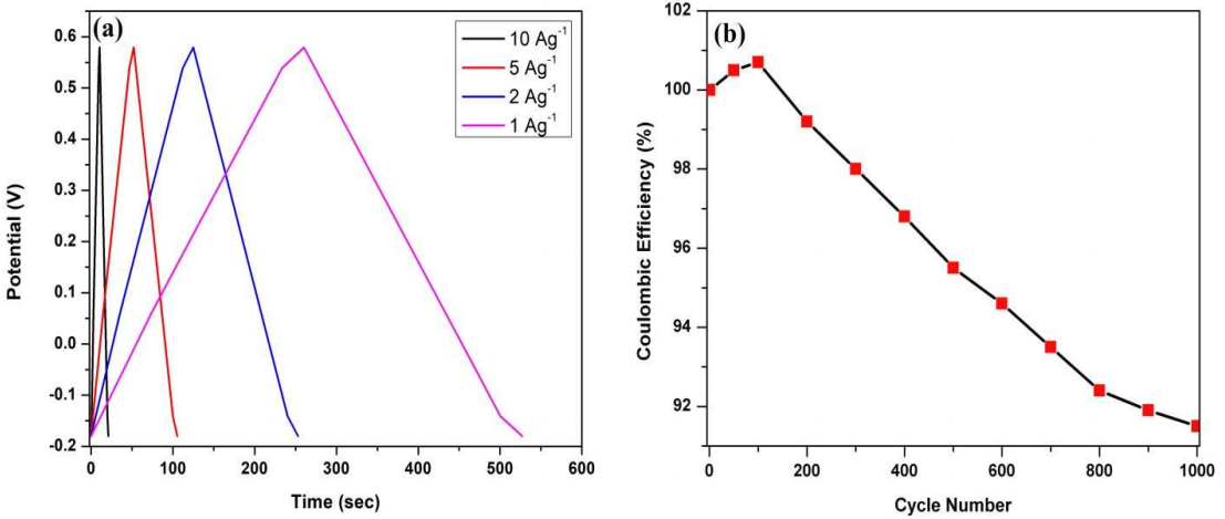 Figure 7: (a) GCD curves of PANI/Mn2CoO4 electrode in a 1 M KOH aqueous solution at different j values; (b) plot of cycle number vs. columbic efficiency.