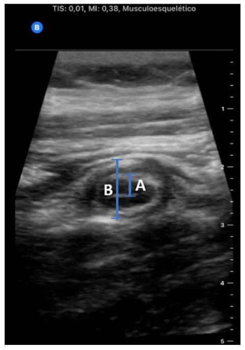 Figure 1: Ultrasound of the appendix, showing acute appendi-citis signs; A- Appendix wall (≈4 mm); B - Appendix diameter (≈10 mm)