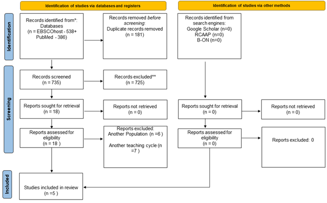 The analysis constitutes the second phase of PRISMA, where, after analyzing the title of the article and the abstract, those that do not meet the previously defined inclusion criteria must be rejected, in accordance with the PCC method, namely the inclusion criteria relating to to the participants. Thus, of the 735 articles in the second phase, 725 articles were rejected, 18 articles were read in full. 13 articles were rejected, taking into account the exclusion criteria: Non-teaching/non-teaching population and other teaching cycles other than the 3rd cycle. Thus, the third phase of PRISMA “Included” appears. At this stage, 5 articles remained, of which 2 were qualitative, 2 were quantitative and 1 was mixed.