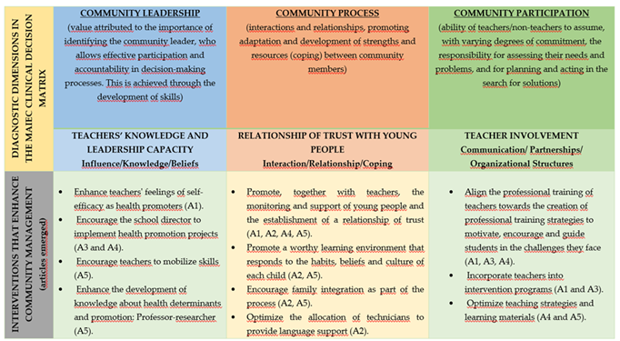 The focuses of community process and community participation, associated with the interaction of community members, are associated with the dimensions of community empowerment. Since community empowerment allows us to obtain more effective results as a process in community intervention (Melo, 2020), the figure below (Figure 2) presents the relationship between the categories (diagnosis dimensions of the model), the subthemes emerging from the articles analyzed (cataloging) and interventions from the MAIEC clinical decision matrix.