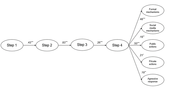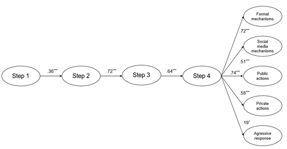 We also tested this alternative sequential process (i.e., a direct link between Step 3 and Step 5) for the remaining models. The results indicate that including this direct link neither improves the model's fit for these actions nor alters the sequential process, supporting the need to maintain the originally proposed sequential structure. Thus, as expected, each step in the model was predicted by the preceding step, except for the models for the Report through social media mechanisms and Private actions subscales. This sequential structure will be further examined in Study 2.
