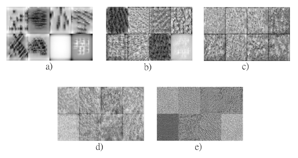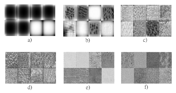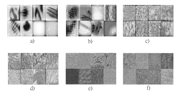 Figura 3 Extracción de características en las capas: a) convolución 1, b) convolución 2, c) convolución 3, d) convolución 4, e) convolución 5 y f) convolución 6.