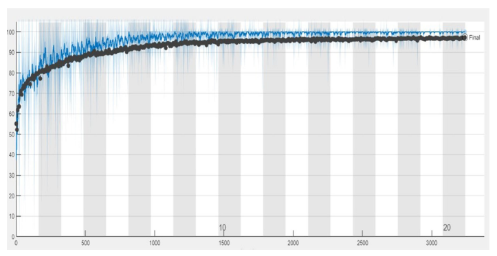 En el entrenamiento del modelo se empleó el gradiente descendente estocástico y los parámetros utilizados fueron; un tamaño de lote de 40 muestras, un máximo de 20 épocas, una tasa de aprendizaje inicial de 0.0001 y una frecuencia de validación de 6 iteraciones. Utilizando el conjunto de entrenamiento que contiene un total de 6493 imágenes, el proceso tardó 506 minutos 22 segundos, obteniendo un porcentaje de precisión de 97.35% con 3240 iteraciones realizadas en 20 épocas como se muestra en la Figura 6, estas pruebas fueron realizadas en un equipo con un GPU Intel i5 NVIDIA GeForce RTX 3050, memoria 32GB.