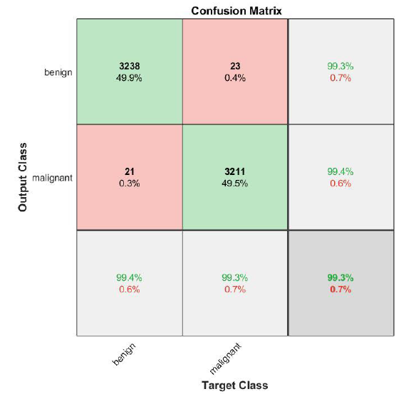 En el caso del conjunto de entrenamiento, cuando se obtuvo la matriz de confusión se encontraron 3238 imágenes de mastografías de la clase benigno clasificadas dentro de esta clase, por lo que fueron los casos verdaderos positivos, de igual manera se obtuvieron 3211 casos de mastografías de la clase maligno clasificadas como tal, lo que representa los casos falsos positivos, mientras que, por otra parte, 23 imágenes de la clase benigno fueron clasificadas en la clase maligno y 21 imágenes de la clase maligno fueron clasificadas en la clase benigno, estas clasificaciones representan los verdaderos negativos y los falsos negativos del conjunto de datos de entrenamiento, estas clasificaciones llevaron a un porcentaje de exactitud del 99.3%.