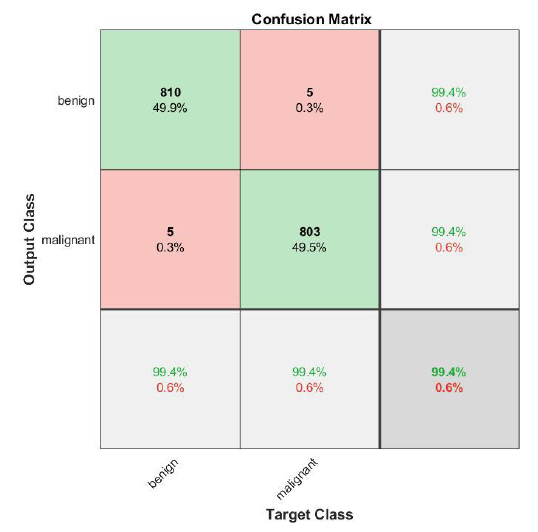 Por otra parte, en el conjunto de validación se clasificaron un total de 810 imágenes de mastografías de la clase benigno dentro de esta misma clase, representando a los casos verdaderos positivos, mientras que, para los falsos positivos que son las imágenes de la clase maligno clasificadas como tal, hubieron 803 casos, por otra parte, tanto para los verdaderos negativos y falsos negativos se obtuvieron 5 imágenes clasificadas incorrectamente para cada uno de los casos, en este conjunto de datos de validación se obtuvo un porcentaje de exactitud del 99.4%.