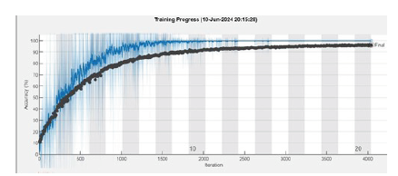 Los parámetros utilizados para el proceso de entrenamiento fueron los siguientes: se empleó el algoritmo de gradiente descendente estocástico, un tamaño de lote de 40 muestras, un máximo de 20 épocas, una tasa de aprendizaje inicial de 0.0001 y una frecuencia de validación de 6 iteraciones. El entrenamiento se llevó a cabo durante 20 épocas, con 202 iteraciones en cada una, sumando un total de 4040 iteraciones en aproximadamente 627 minutos, utilizando un conjunto de 8088 imágenes. Estas pruebas se realizaron en una computadora equipada con un procesador Intel i5, GPU NVIDIA GeForce RTX 3050 y 32 GB de memoria RAM. El resultado obtenido fue un porcentaje de precisión del 96.24%, como se muestra en la figura 7.