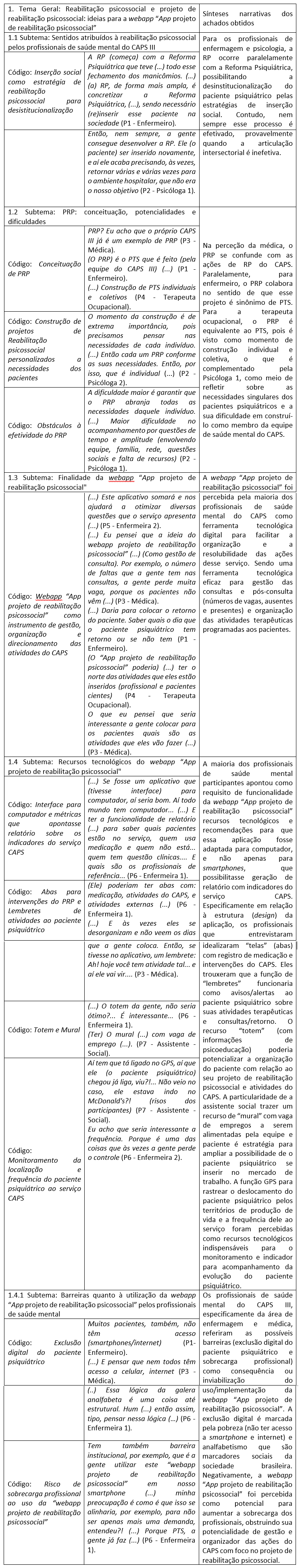 Ademais, o critério de saturação utilizado nesta investigação foi estrutural, considerando a representatividade da amostra, o tempo e o alcance dos objetivos da pesquisa em uma única sessão de grupo focal. Os requisitos para a prototipagem da webapp "App projeto de reabilitação psicossocial" foram obtidos em uma única entrevista de grupo focal, com a presença de mais de 70% dos profissionais de nível superior vinculados ao CAPS (Bomfim, 2009; Minayo, 2017).