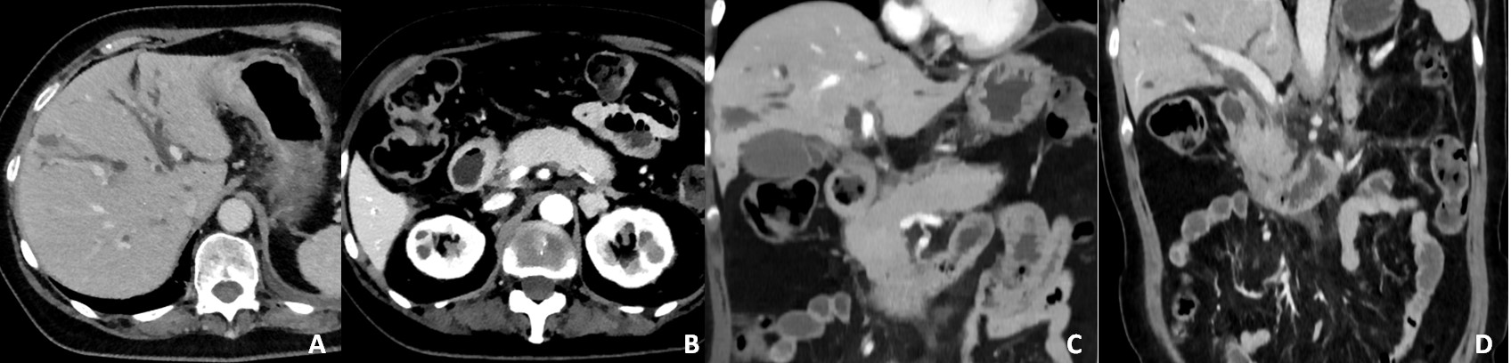 Figure 1: Abdominal CT (A, B) axial portal-phase and (C, D) coronal portal-phase, demonstrating diffuse intra-hepatic bile duct dilatation (A) and diffuse enlargement of the pancreas (B, C) and peri-pancreatic fat stranding (D).