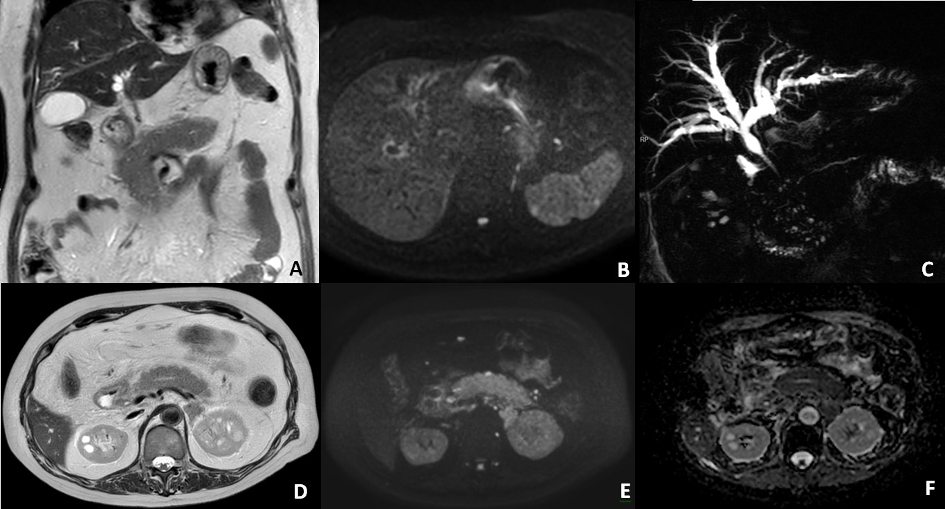 Figure 2: Cholangiopancreatography MRI (A) coronal T2W (C) radial CPRM; (D) axial T2W (B, E) DWI (F) ADC map; showing increased thickness of the pancreatic parenchyma (A, B) and diffuse restricted diffusion of the parenchyma (E, F). Diffuse intra-hepatic bile duct dilatation and dilatation of the distal part of the extra-hepatic bile duct, with increased thickness of the bile duct wall (A, C). A long regular stenosis of the distal part of the extra-hepatic bile duct is also present (C). Restricted diffusion of the intra-hepatic bile ducts is shown (B).