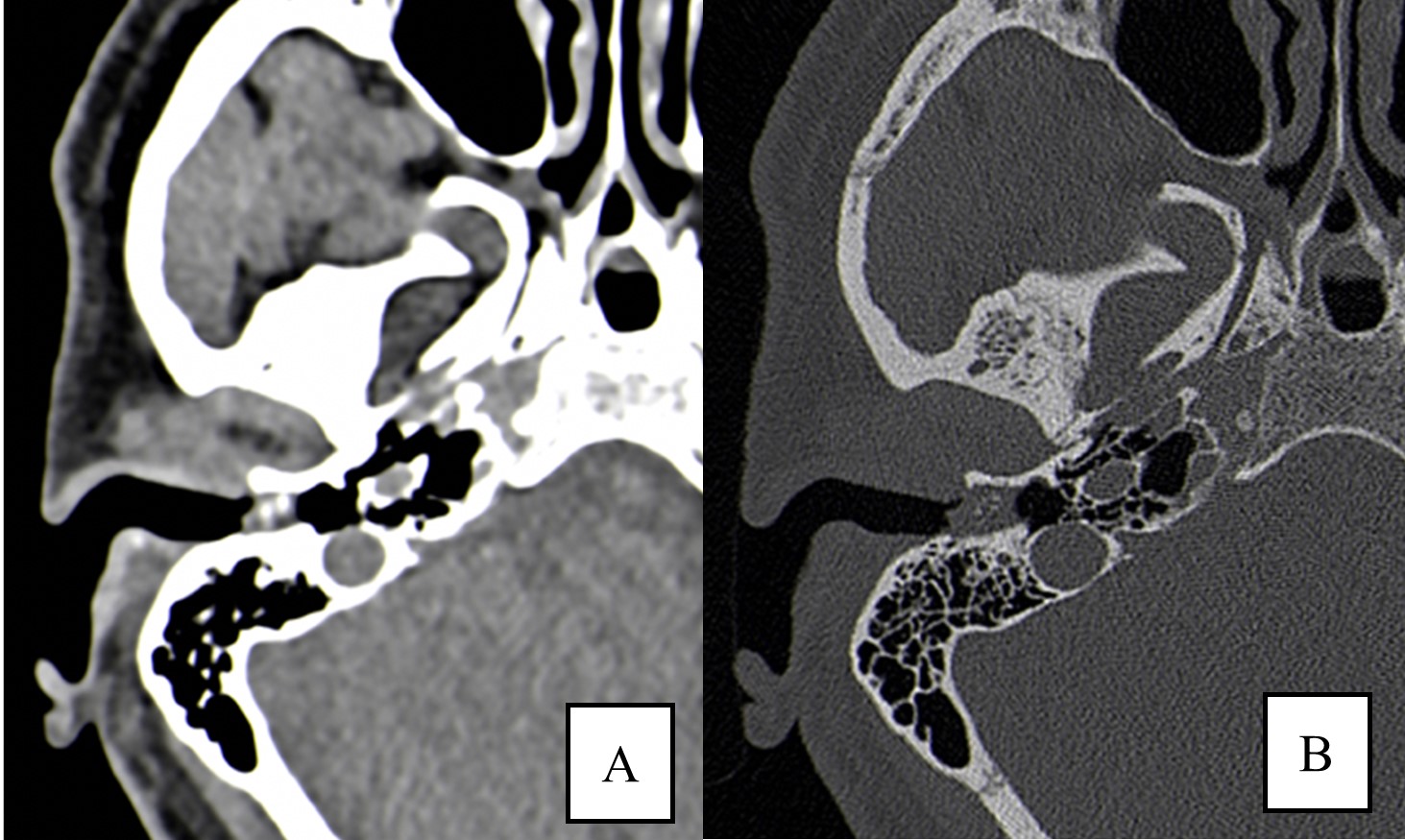 Figure 1: (A) High-resolution CT of temporal bone in axial section depicts a lesion of the right EAC on the soft tissue window setting. (B) High-resolution CT of temporal bone in axial section depicts a lesion of the right EAC on a narrowed window width setting. There is erosion of posterior wall and bony sequestrum within the lesion.