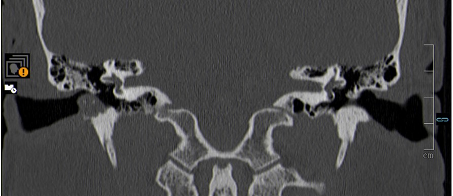 Figure 2: Coronal temporal bone CT image shows an EAC cholesteatoma as a soft-tissue mass in the inferior EAC, with associated erosion of the subjacent bone and small bone flecks inside the lesion.