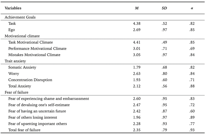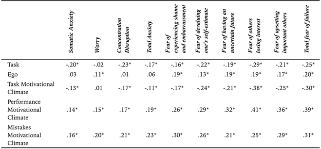 Table 2: Bivariate correlations between achievement goals, perceived motivational climate, anxiety and fear of failure.