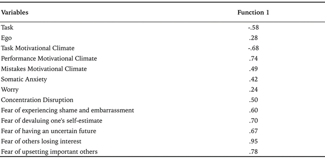 The redundancy index for the first function indicated that 10.7% of the variance in the cognitive orientations and motivational climate set (Set 1) could be explained by the canonical variable from the anxiety and fear of failure set (Set 2). Conversely, 13% of the variance in set 2 was explained by the canonical variable from set 1. For the second function, redundancy indices were notably lower, with only 1.6% of the variance in set 1 and 1.2% of the variance in set 2 explained. Similarly, for the third function, only 1% of the variance in Set 1 and less than .05% of the variance in Set 2 were explained. Nonetheless, although all three canonical functions were statistically significant and thus relevant from a statistical perspective, the low redundancy indices and percentages of variance explained by the second and third functions suggest limited practical relevance. Consequently, we focused primarily on the first canonical function, which explains the largest variance percentage.