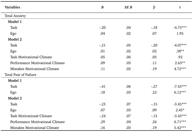 Finally, two multiple regression analyses (Table 4) were conducted to evaluate the relationship between achievement goals and motivational climates (predictor variables) and total anxiety and total fear of failure (dependent variables).
