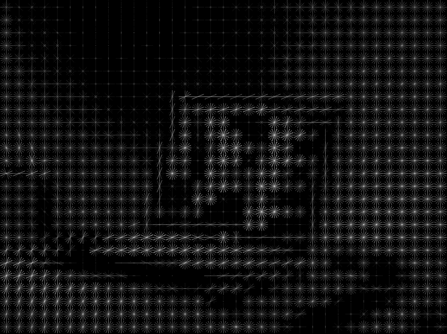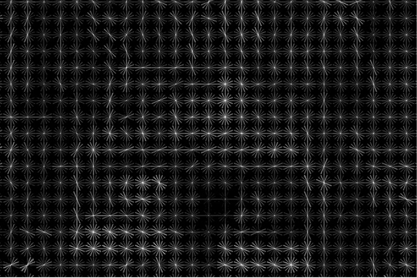 Sometimes Your Eyes Do Not See (ver Figura 1, Figura 2, Figura 3, Figura 4, Figura 5, Figura 6 e Figura 7) é uma tentativa de explorar o mundo visual das máquinas, composto por gradientes, pontos-chave, caixas delimitadoras e imagens segmentadas manualmente, e a convicção de longa data que impulsionou o desenvolvimento da visão artificial: é possível destilar a complexidade do mundo visual em pontos de dados. O projeto utiliza uma técnica de descritor de características, que simplifica uma imagem extraindo informações úteis, denominada "histograma de gradientes orientados" (HOG), representada na forma de gradientes - observe-se a forma branca "estrelada" nas imagens do projeto (para uma visualização mais detalhada, consulte a Figura 2 abaixo), que se assemelha à distribuição de luz numa determinada imagem. Concebida nos anos 80, esta técnica ganhou destaque na década de 90, quando investigadores do Instituto Nacional de Pesquisa em Ciências e Tecnologias Digitais em França começaram a utilizá-la para a deteção de peões e veículos em imagens. Nesta técnica, a imagem é dividida em pequenas regiões interligadas, chamadas "células", formando uma grelha. Cada célula é então analisada para gerar um histograma de gradientes dentro da célula. O gradiente em cada ponto da imagem indica a direção e a força da alteração mais significativa no brilho, captando eficazmente as arestas ou contornos dos objetos numa imagem específica. Por outras palavras, o gradiente tenta "descrever" a aparência dos objetos numa imagem, realçando onde ocorrem as alterações de intensidade mais visíveis. O conceito chave é o facto de objetos diferentes poderem ser distinguidos uns dos outros pelo seu gradiente distintivo de padrões. Estes padrões únicos são depois utilizados para treinar um algoritmo para distinguir objetos ou classes de objetos, por exemplo, para distinguir cães de gatos numa base de dados de imagens de animais.