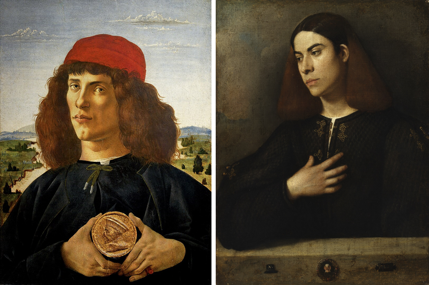 Credits. Sandro Botticelli, 1474 (https://commons.wikimedia.org/wiki/File:Portrait_of_a_Man_with_a_Medal_of_Cosimo_the_Elder_-_Sandro_Botticelli_(edit).jpg)/Giorgione da Castelfranco, 1508-1510 (https://commons.wikimedia.org/wiki/File:Portrait_of_a_Young_Man_Giorgione__Museum_of_Fine_Arts_-_Budapest.jpg