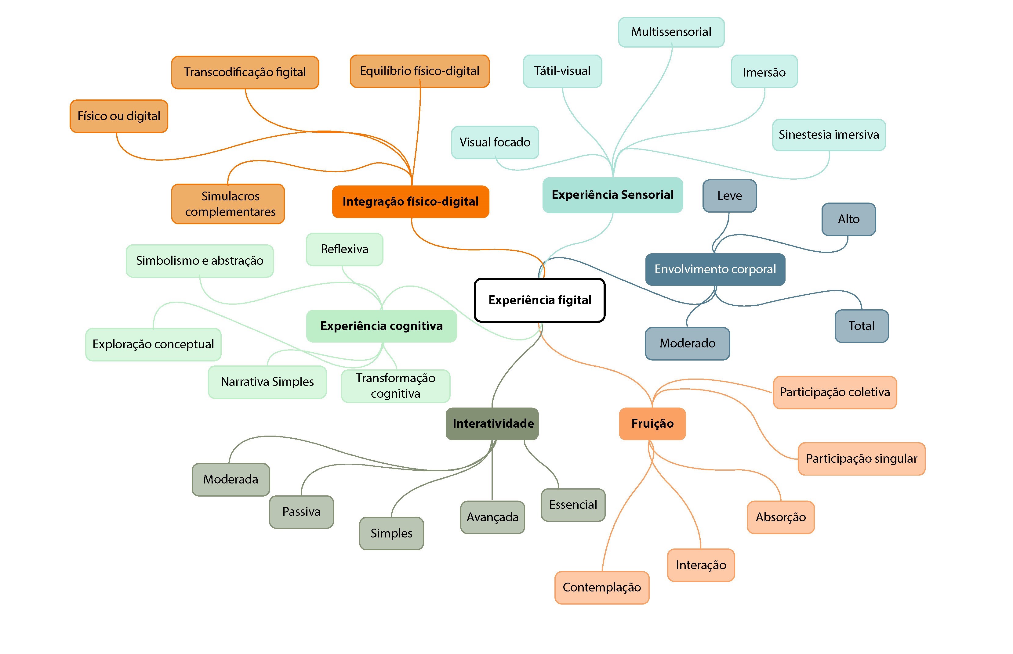 A taxonomia figital aqui apresentada fundamenta-se na integração e na síntese crítica das contribuições teóricas de vários autores, destacando-se Lev Manovich (2001), Oliver Grau (2002), Jewitt et al. (2021), Kiousis (2002), Hansen (2003), Munster (2011) e Dewey (1934), bem como nas abordagens recentes ao conceito figital apresentadas por Del Vecchio et al. (2023) e Fadeeva e Staruseva-Persheeva (2023). A proposta aqui desenvolvida organiza-se em seis dimensões: (a) integração físico-digital, (b) experiência sensorial, (c) experiência cognitiva, (d) fruição, (e) interatividade, e (f) envolvimento corporal - todas elas fundamentais para compreender a relação físico-digital no próprio artefacto, bem como a relação entre esse artefacto e o público. Estas dimensões orientam práticas artísticas e culturais, servindo como referência para artistas, curadores e investigadores na criação e análise de artefactos híbridos. Para avaliadores, fornecem critérios objetivos, facilitando uma crítica contextualizada, útil a esta forma de arte contemporânea.