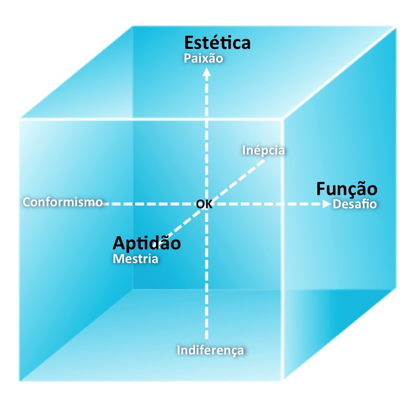 A metodologia a/r/cográfica define um espaço tridimensional para a (auto)avaliação dos artefactos criados, sustentado por três eixos fundamentais: estética, aptidão ou técnica, e função ou impacto. Este espaço está representado na Figura 2.