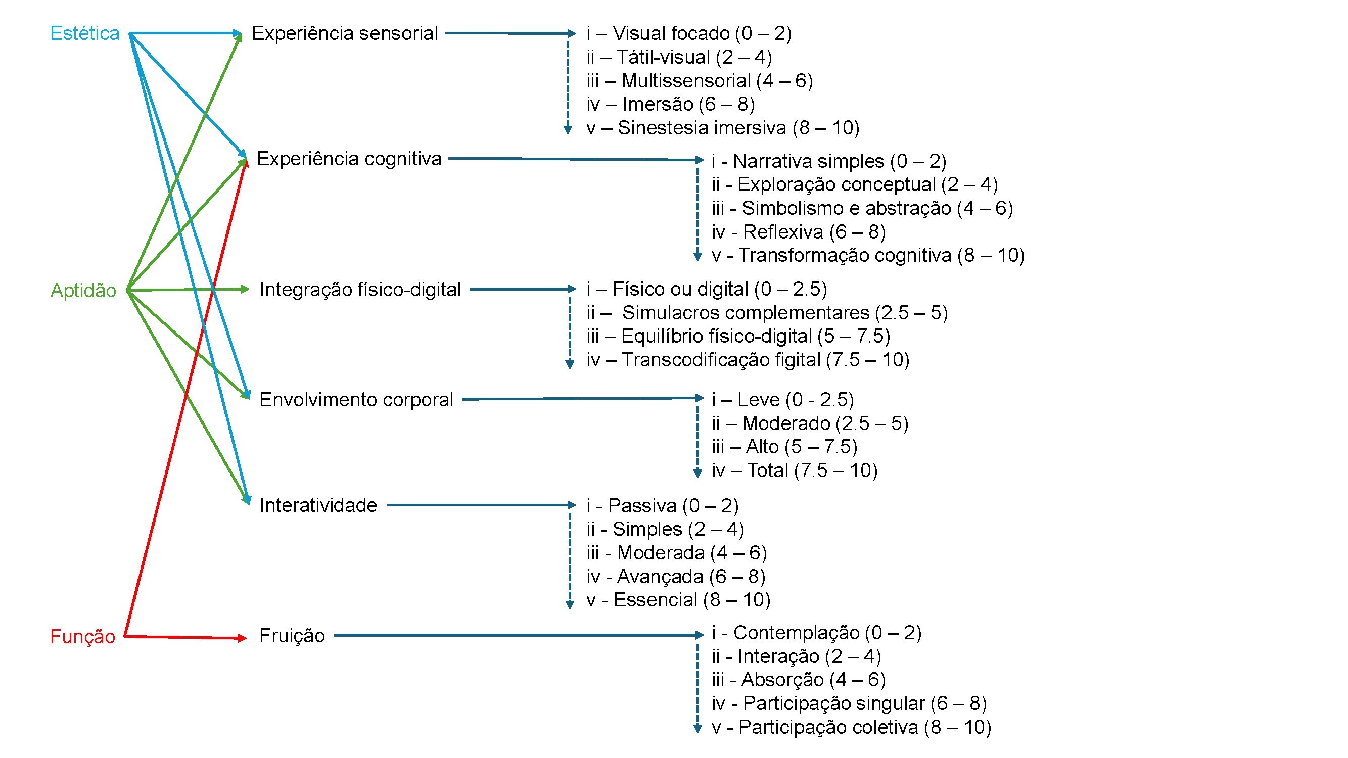 nível n corresponde ao intervalo numérico entre (n-1)*10/4 e (n-1)*10/4+10/4). Assim, propõe-se também para cada dimensão uma classificação qualitativa, em níveis específicos. A correspondência destes níveis com a escala de 10 valores é feita pela fórmula acima, permitindo caracterizações mais detalhadas das práticas figitais, evitando simplificações que comprometam a compreensão da diversidade e riqueza expressiva dos fenómenos híbridos.