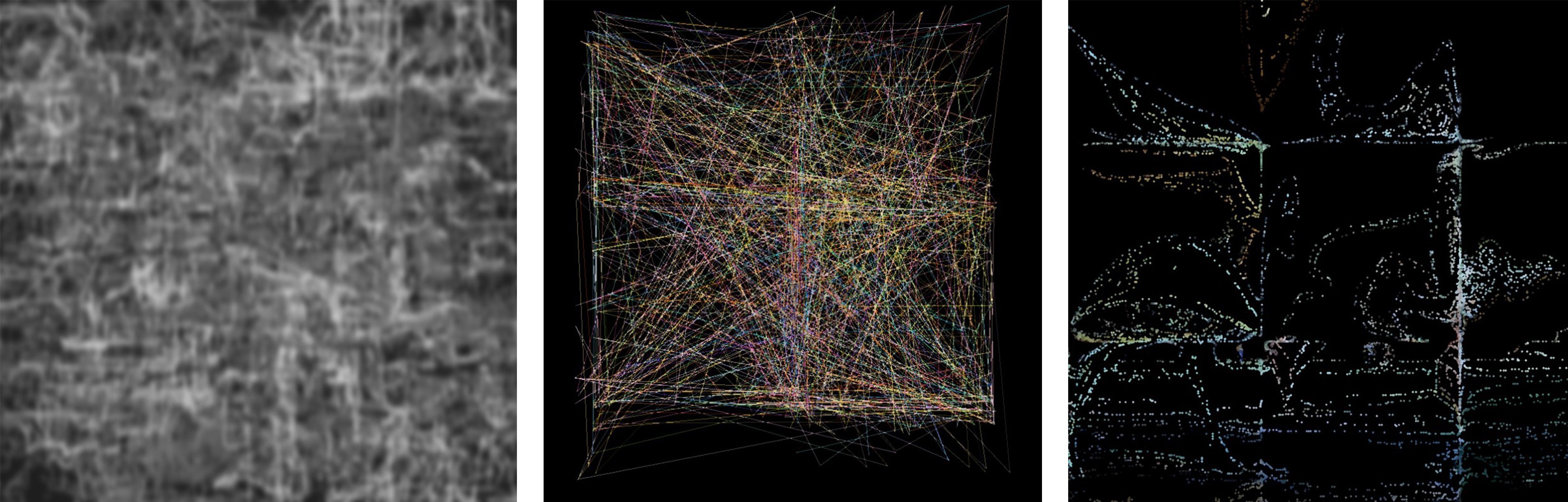 Após gerar várias imagens sintéticas, foram extraídas linhas estruturais com a biblioteca OpenCV1 (Python), servindo de base à composição. A obra organizase em três ecrãs interativos, inspirados na metáfora do tear: o primeiro apresenta linhas difusas em preto e branco, provenientes das imagens sintéticas, sugerindo o início criativo da tecelagem; o segundo exibe linhas definidas, extraídas de tapeçarias originais e imagens geradas, que reagem ao movimento do público, simbolizando a plasticidade cultural; o terceiro transforma essas linhas em partículas manipuláveis por gestos, captados via Mediapipe2, permitindo interação em tempo real, numa referência à ação manual no tear. O movimento cíclico das linhas animadas liga o artesanal ao digital, preservando dinamicamente o ADN cultural. Assim, Texel2048Loom reinterpreta a tradição com tecnologia, evidenciando o potencial do património cultural para criar novas experiências estéticas e comunicativas.