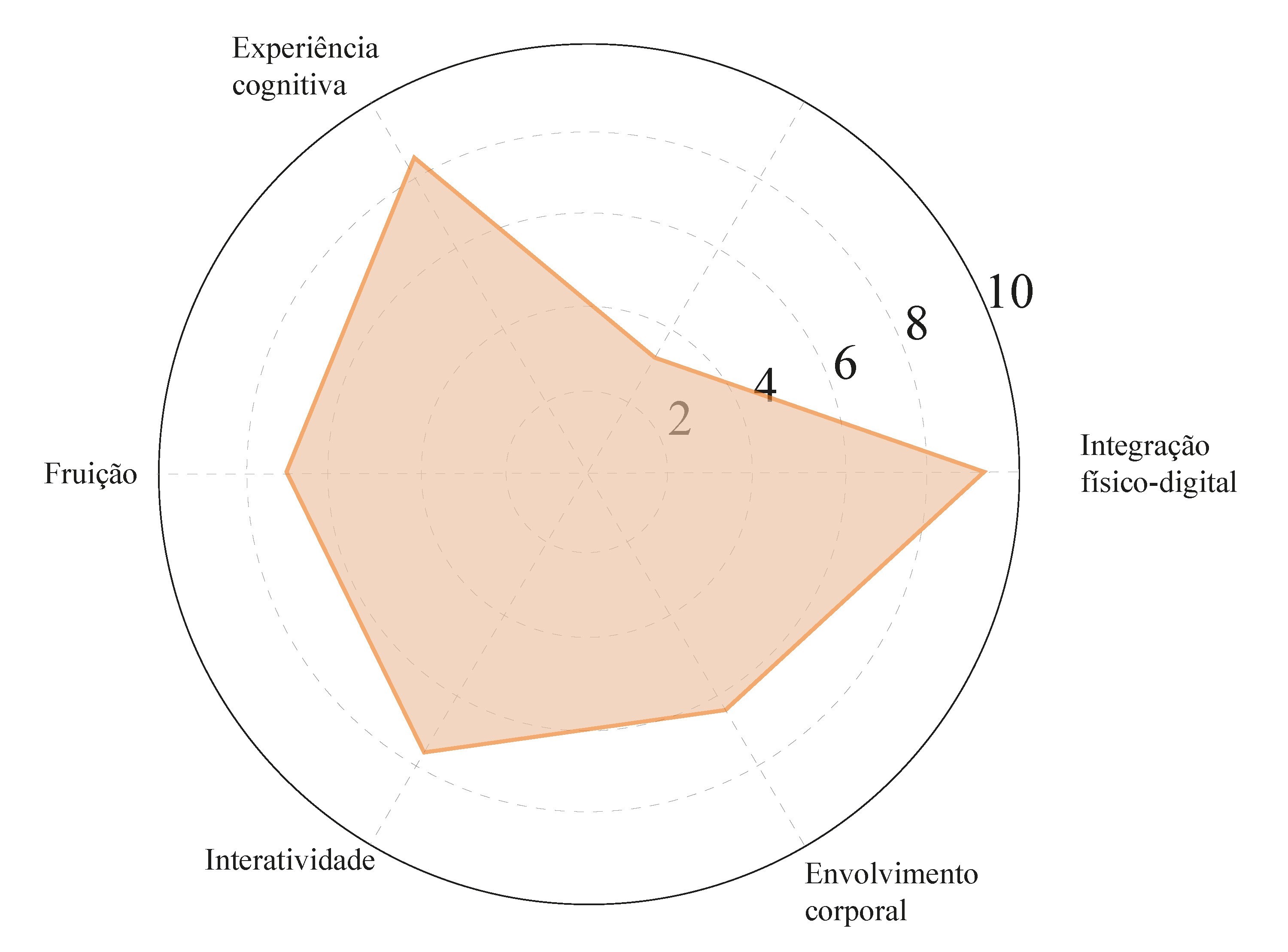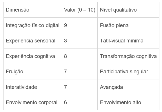 Envolvimento corporal - 6: o corpo atua como gatilho essencial, mas a participação permanece predominantemente gestual; existe margem para maior performatividade ou feedback bidirecional (ver Figura 7).