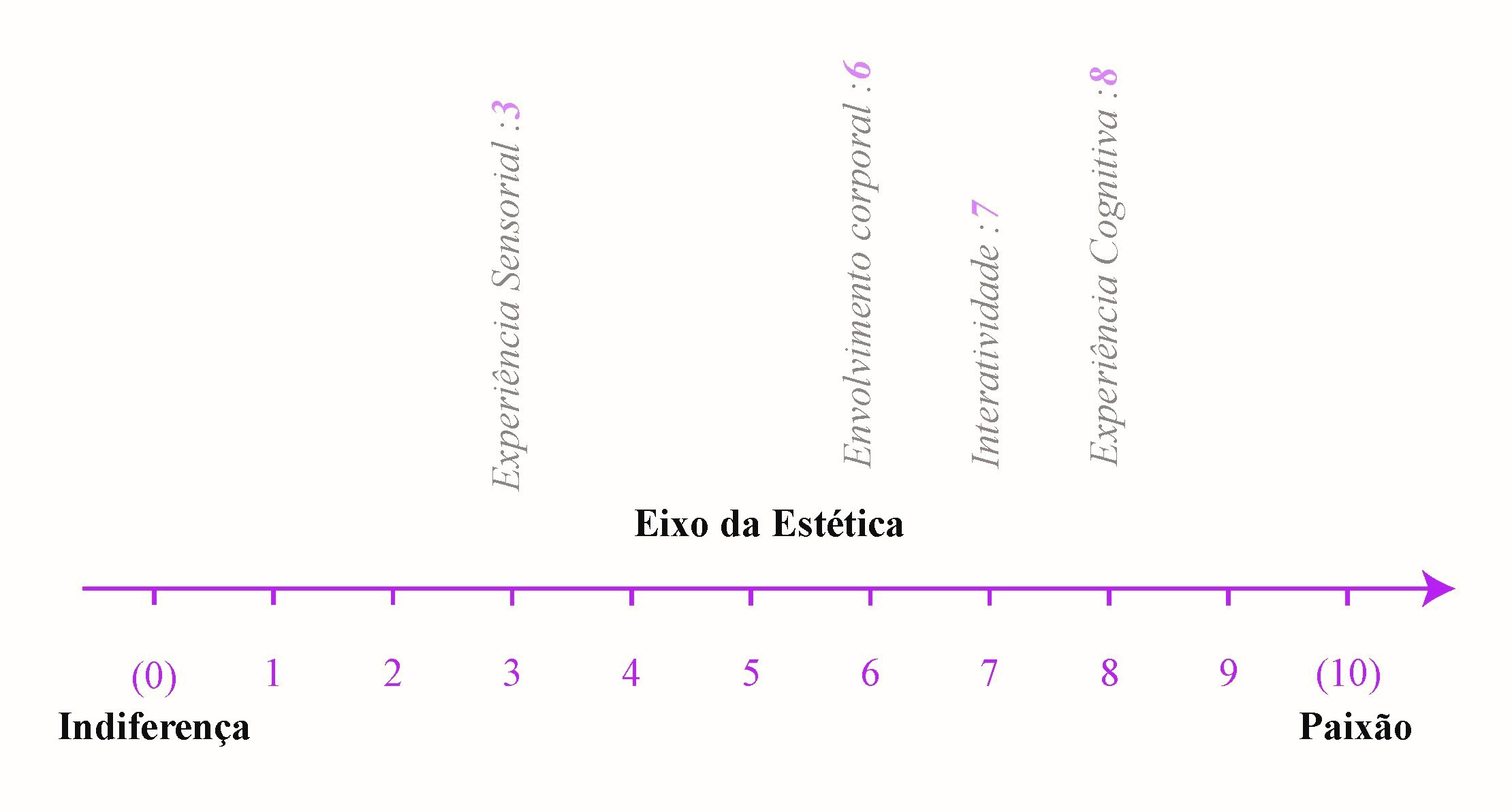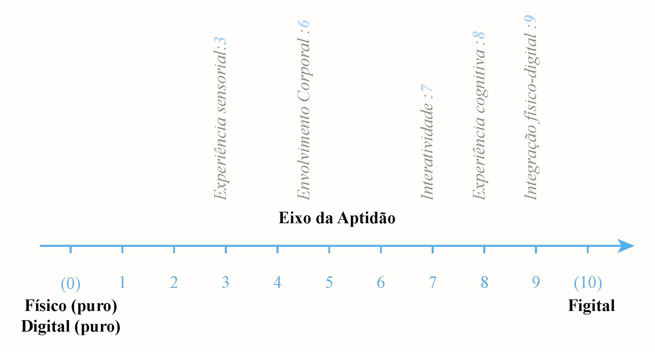 Na dimensão figital, propõe-se que o valor mais baixo da escala reflete tanto o digital puro como o físico puro, indicando ausência de integração significativa entre estes elementos. O valor 10 simboliza combinação ideal, onde ambos se equilibram numa representação coerente da sua simbiose. Esta definição clarifica os extremos da escala, permitindo avaliar intensidade e qualidade da articulação físico-digital.